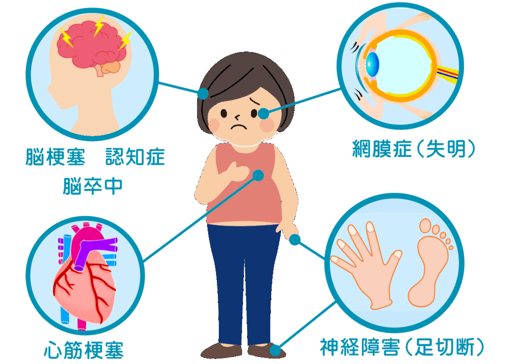 神経細胞に血液が届かなくなり、全身の神経に障害が出ます。ちょっとした傷や水虫から足が腐り、切断しなければいけなくなります。